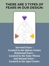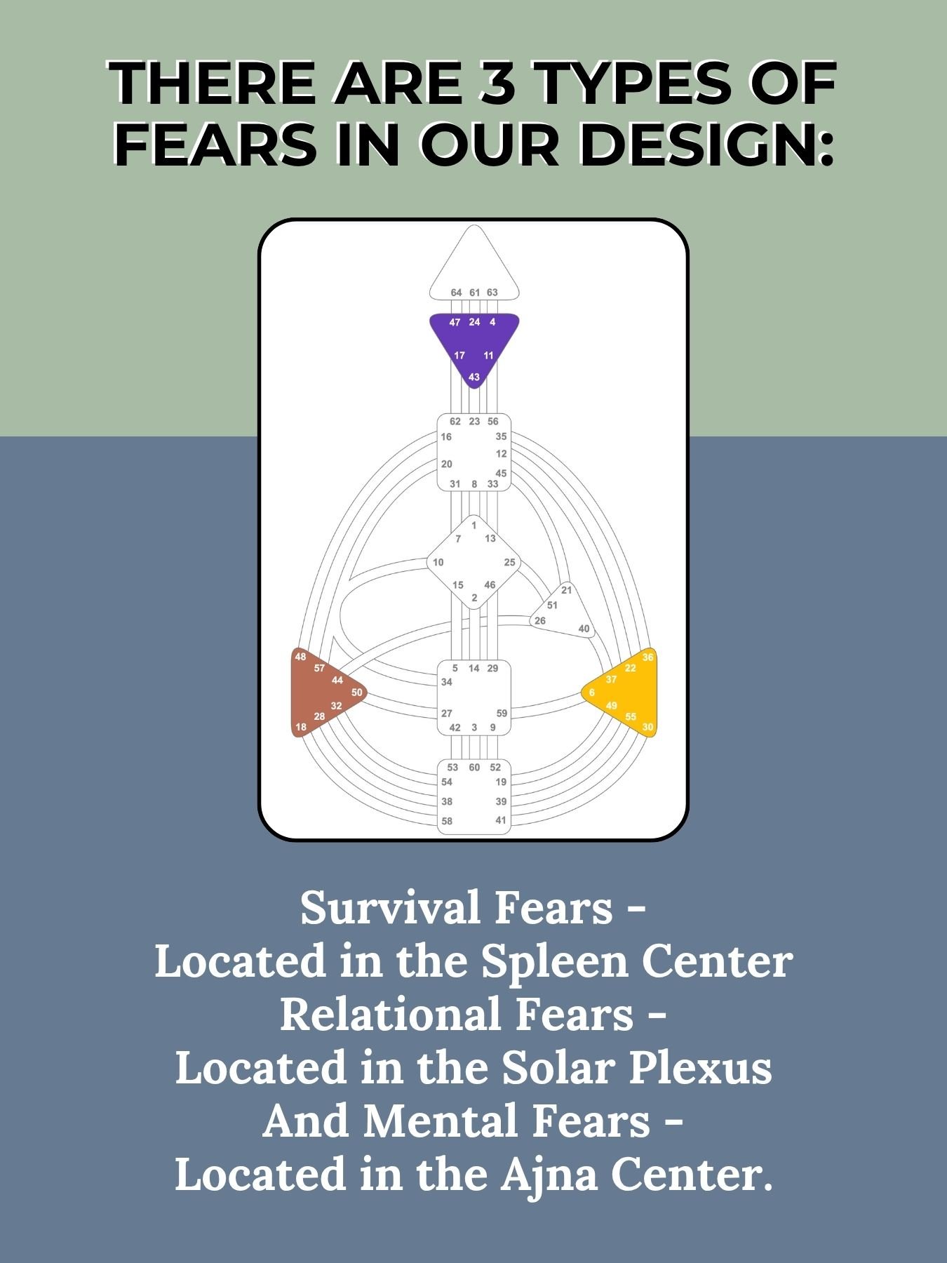 The Human Design Bodygraph shines a light on 20 FEAR Gates- gates located in your Ajna, Spleen, and Solar Plexus centers, represting: Mental, Survival & relational fears. Overcoming these fears is something done through the process of Awareness.
